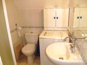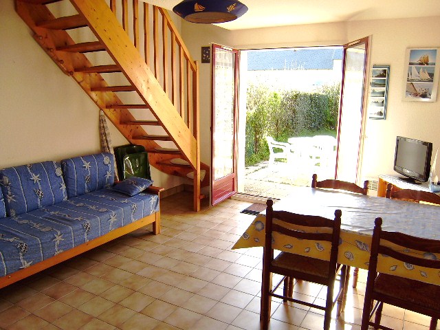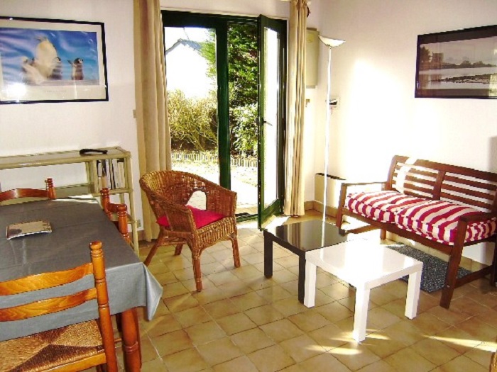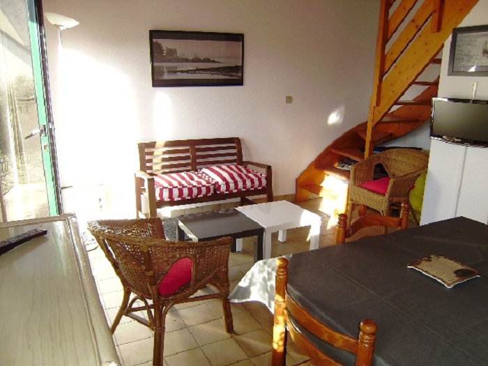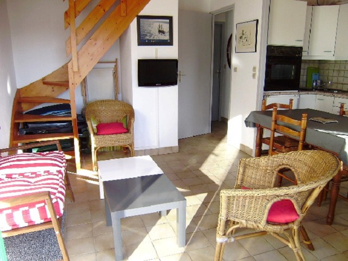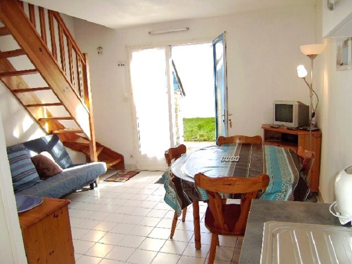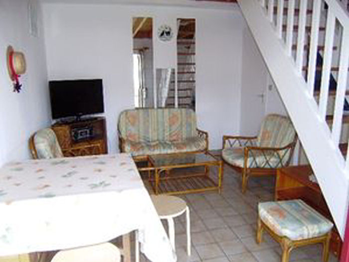 Maisonnette 3 pièces 4/6 personnes, de 40m², composé au rez de chaussée d'un séjour avec canapé-lit (2 personnes), d'une kitchenette équipée, d'une salle de bains avec baignoire et de WC séparés.A l'étage, une chambre avec un lit double et une chambre avec 2 lits simples.La maisonnette dispose également d'un petit jardin clos avec terrasse, un cellier et un garage individuel.