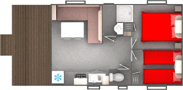 Mobil-home 3 pièces 4 personnes de 23m² environ composé d'un séjour, d'un coin repas, d'une kitchenette équipée, d'une chambre avec un lit double, d'une seconde chambre avec deux lits simples, d'une salle de douche avec WC intégrés et d'une terrasse en bois semi-couverte.