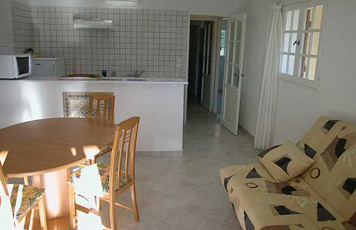 3 Pièces 4 Personnes de 40m² composé d'un salon / salle à manger avec un clic-clac pour 2 personnes, d'une chambre avec un lit double, d'une salle de bains, d'une cuisine équipée et d'un WC. La villa dispose également d'un pool-house à partager avec les colocataires.