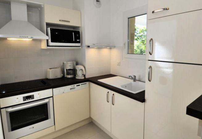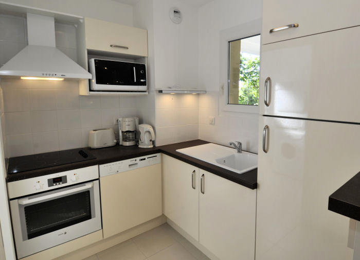L'appartement comprend une kitchenette équipée de plaques vitrocéramiques, d'une réfrigérateur-congélateur, d'une four traditionnel, d'un micro-ondes, d'un lave vaisselle, d'une hotte aspirante de petit électroménager (cafetière, grille pain et bouilloire électrique). Vous trouverez également : lave linge, sèche linge, table et fer à repasser, aspirateur, TV.