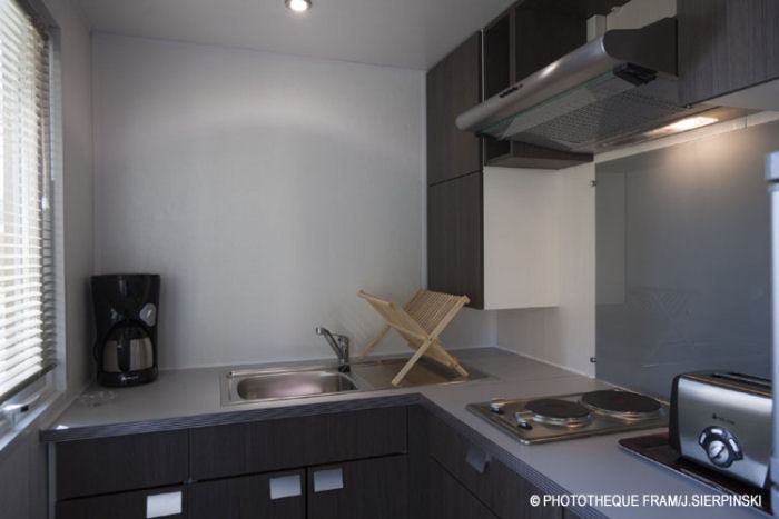 Dans le coin cuisine vous trouverez des plaques électriques, un four micro-ondes, un réfrigérateur/congélateur, placardes de rangements, ainsi que l'ensemble des ustensiles de cuisine. Le linge de lit vous est fourni (avec alèse, drap housse, couette et oreiller). Pour votre confort, le bungalow dispose d'une télévision écran plat (chaînes TNT) et d'un lecteur DVD.