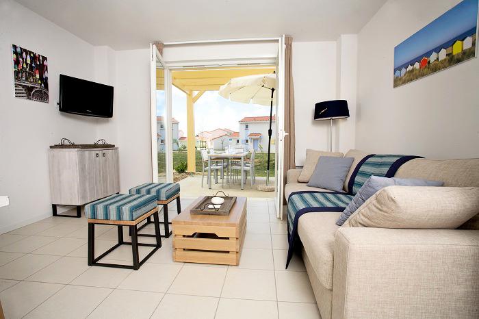 La résidence Vacances LE VILLAGE DE LA MER se trouve à 7 km plages, 3,5 km des premiers commerces, 5 km du centre, 3 km du golf de Port-Bourgenay. Composée de maisonnettes accolées réparties sur 7 hameaux, elle vous plonge dans l'atmosphère d'un village vendéen.VOTRE MAISONNETTE EST ÉQUIPÉE d'une kitchenette avec plaques vitrocéramiques + lave-vaisselle, terrasse avec salon de jardin.34 m² environ, séjour canapé-lit 2 personnes, chambre 2 lits 1 personne, salle de bains ou douche.INFORMATIONS PRATIQUES : (A préciser dès la réservation)¤ Parking gratuit (1 place/maisonnette)¤ Télévision gratuite¤ Animaux 7 EUR/animal/jour ; 39 EUR/animal/semaine (2 max/maisonnette)Le prix de votre séjour s'entend par logement par semaine (Du 6/7 au 7/9 : séjour uniquement en samedi/samedi)Court séjour (2 nuits minimum) incluant les draps, le linge de toilette et le ménage final (sauf kitchenette)SERVICE GRATUITS : ¤ Une piscine extérieure chauffée (ouverte de mi-mai à mi-septembre selon météo) + bain à remous¤ 1 séance de sauna offerte par logement et par semaine¤ Court de tennis*, ping-pong* (* prêt du matériel selon dispo.)¤ Salle de fitness¤ Local à vélosSERVICE PAYANT : ¤ Sauna et Hammam 8 EUR/séance/appartement et 39 EUR/6 séances/appartement¤ Accès wi-fi dans la majorité des maisonnettes¤ Location de lit et chaise bébé* 5 EUR/jour, 15 EUR/séjour ; kit bébé* (lit + chaise) 7 EUR/jour, 25 EUR/séjour (* selon disponibilité, à préciser dès la réservation)¤ Laverie¤ BillardNous vous proposons 5 formules de SERVICES HOTELIERS A préciser et à régler dès la réservation¤ Lits faits à l'arrivée¤ Ménage de départ (sauf kitchenette)¤ Lits faits à l'arrivée + ménage de départ (sauf kitchenette)¤ DRAPS¤ KIT LINGE (drap de bain, serviette de toilette et torchon)A préciser et à régler dès la réservation