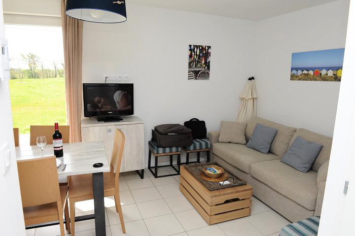 Maisonnette de 2 Pièces de 34m² pour 2 à 4 personnes, composée d'un séjour avec canapé-lit pour 2 personnes et coin cuisine, d'une chambre avec 2 lits simples, d'une salle de bains avec baignoire ou douche.A noter : certains appartements sont adaptés pour accueillir des personnes à mobilité réduite : se renseigner auprès de notre service réservation.