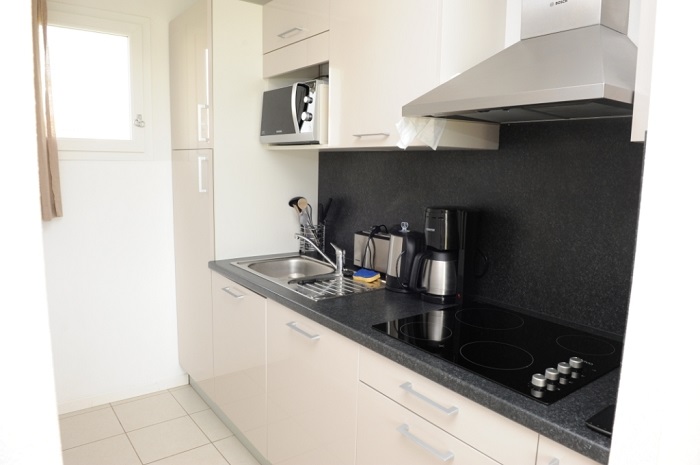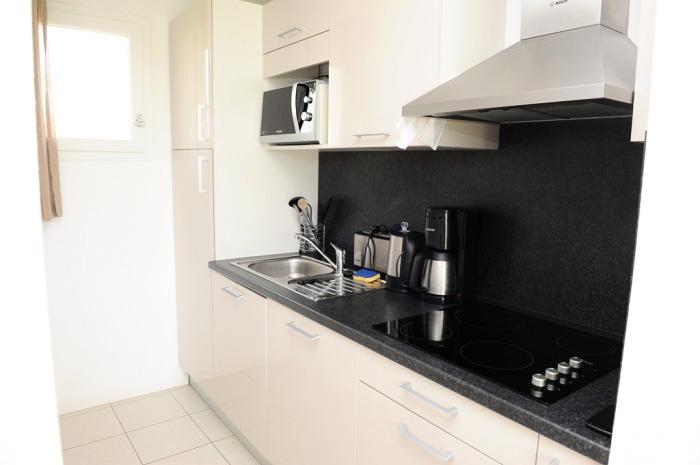 Ce logement dispose d'une kitchenette entièrement équipée avec réfrigérateur, plaques vitrocéramiques, lave-vaisselle, micro-ondes, cafetière, ustensiles de cuisine et vaisselle pour 6 personnes.Linge de lit et de toilette fournis.