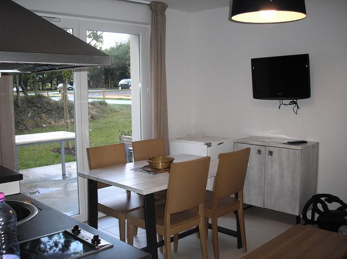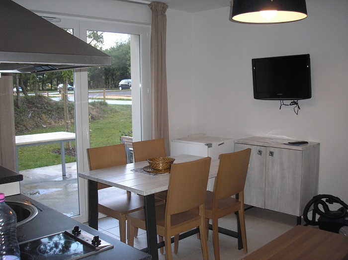 La kitchenette comprend un réfrigérateur, des plaques vitrocéramiques, un lave-vaisselle, un micro-ondes, une cafetière électrique, les ustensiles de cuisine et vaisselle pour 6 personnes. Chaque couchage inclut le linge de lit, les couvertures et oreillers (lits non faits). Le logement est également équipé d'une télévision écran plat et d'un aspirateur. La terrasse dispose d'un salon de jardin.