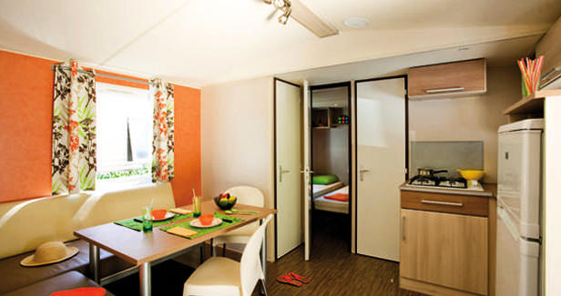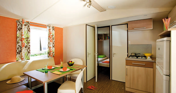 Mobil Home de 21m² environ pour 6 personnes, composé d'un séjour avec banquette et coin cuisine équipé, d'une chambre avec 1 lit double, de 2 chambres avec 2 lits simples ou superposés, d'une salle d'eau avec lavabo et douche et de WC séparés pour la plupart des logements. À noter: Le lit superposé ne convient pas aux enfants de moins de 10 ans. Capacité maximum: 6 Personnes bébé compris.