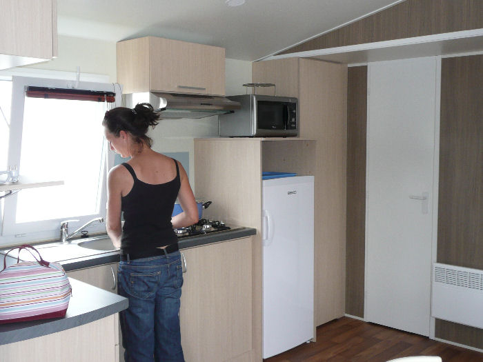 Mobil Home de 3 pièces pour 4 à 6 personnes de 24m² composé d'un séjour avec une banquette lit pour 2 personnes, d'une chambre avec un lit double, d'une seconde chambre avec 2 lits simples, d'un coin cuisine tout équipé, d'une salle d'eau avec une cabine de douche et des WC indépendants.