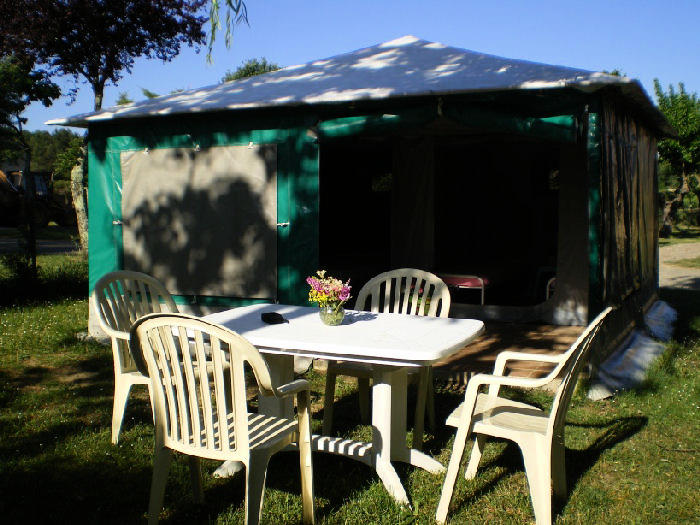 Bungalow toilé d'environ 19m² pour 4 personnes, composé d'un coin séjour avec une kitchenette équipée, d'un coin nuit avec "côté parent" un lit double et "côté enfant" 2 lits simples. A noter : le bungalow ne possède pas d'arrivée d'eau (pas d'évier ni de sanitaires). Le bloc sanitaire du camping se situe à proximité. Ce logement atypique est un bon compromis entre le confort d'un mobil home et les vraies valeurs du camping, proche de la nature.