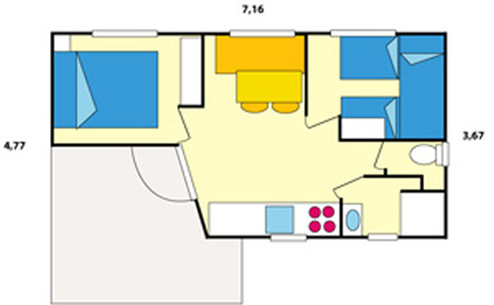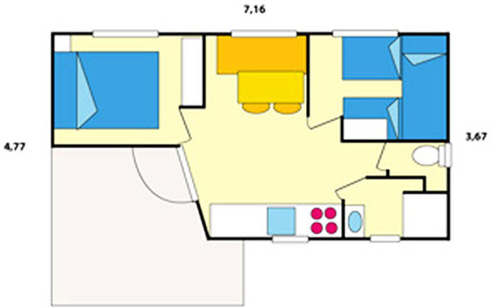 Bungalow Mobil de 23m² environ pour 4/6 personnes, composé d'une kitchenette équipée, d'un séjour avec un coin repas et une banquette convertible en couchage pour 2 personnes, d'une chambre avec un lit double, d'une chambre avec 2 lits simples, d'une salle de bains avec une douche, d'un WC et d'une terrasse.