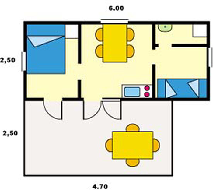 Chalet 4 personnes de 6m X 2.50 composé d'une chambre avec un lit 2 personnes et une chambre avec 2 lits simples superposés, et d'un coin cuisine.