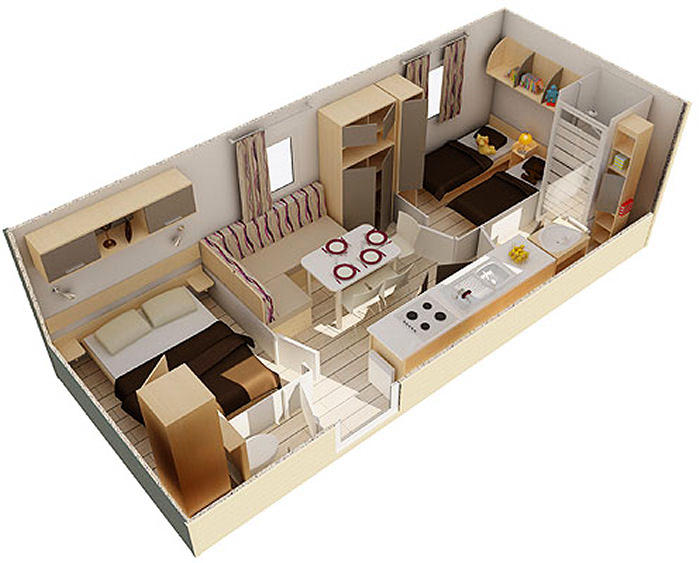 Mobil home de 34m² pour 6 personnes, composé d'un séjour avec cuisiné équipée, d'une chambre avec un lit double, de 2 chambres avec 2 lits simples séparés, d'une salle d'eau avec douche, d'un WC séparé et d'une terrasse.