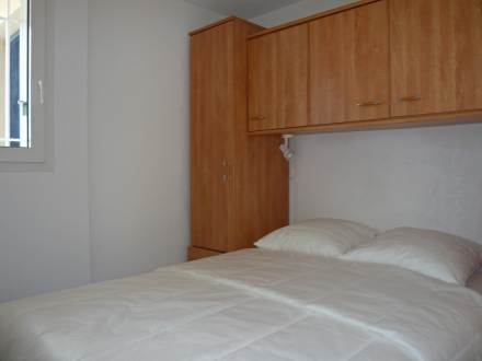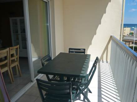 Apt 2 pièces 27 m2 au 3ème étage: séjour/salle à manger avec 1 divan-lit double, TV, écran plat, radio et ventilateur. Sortie sur la terrasse. 1 chambre avec 1 grand-lit. Coin cuisine (four, plaque vitro céramique, four micro-ondes, congélateur). Douche, WC séparé. Terrasse 8 m2, couverte, situation sud. Meubles de terrasse, barbecue. Vue partielle sur la mer. A disposition: lave-linge, fer à repasser. Place de parking.