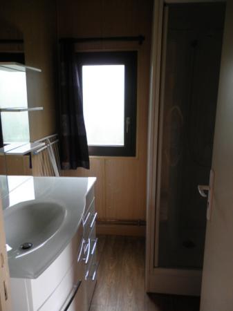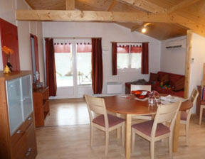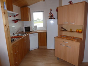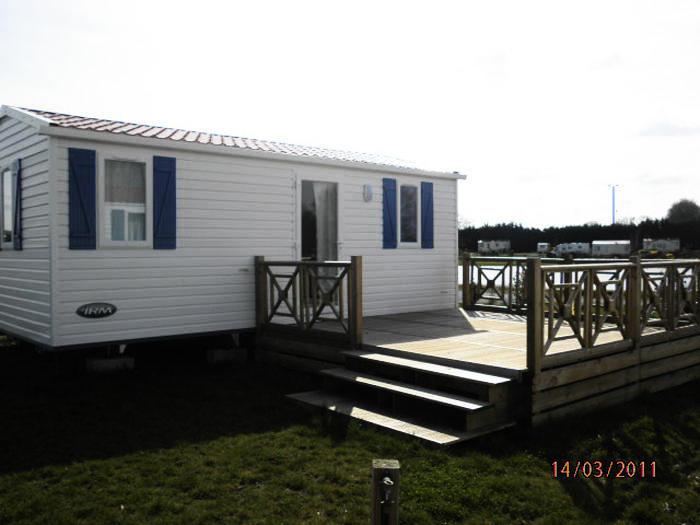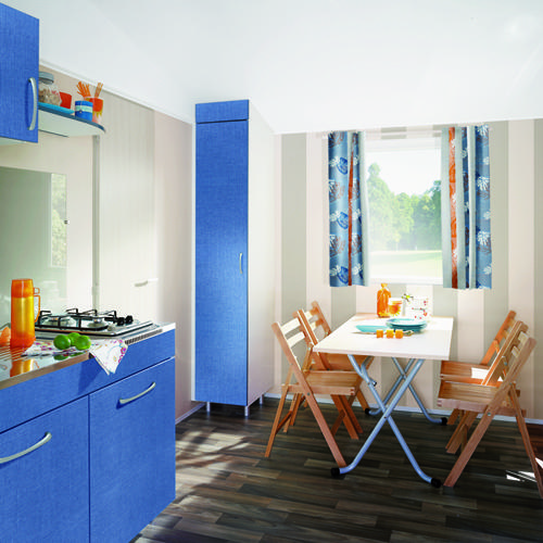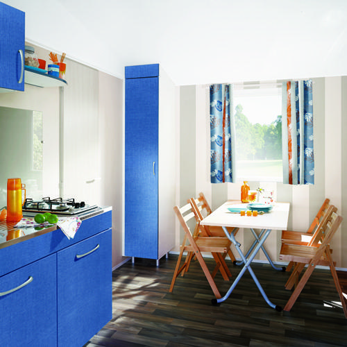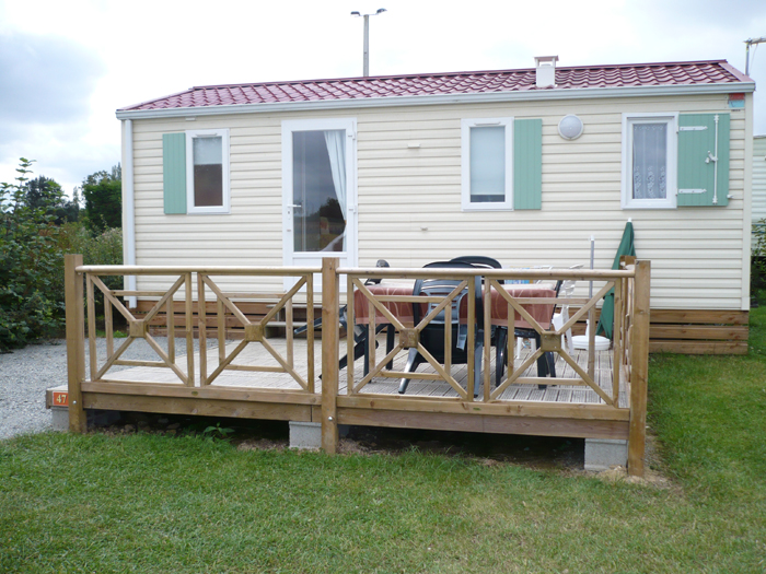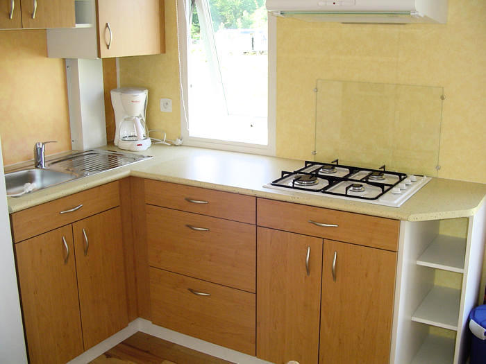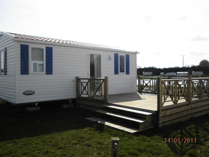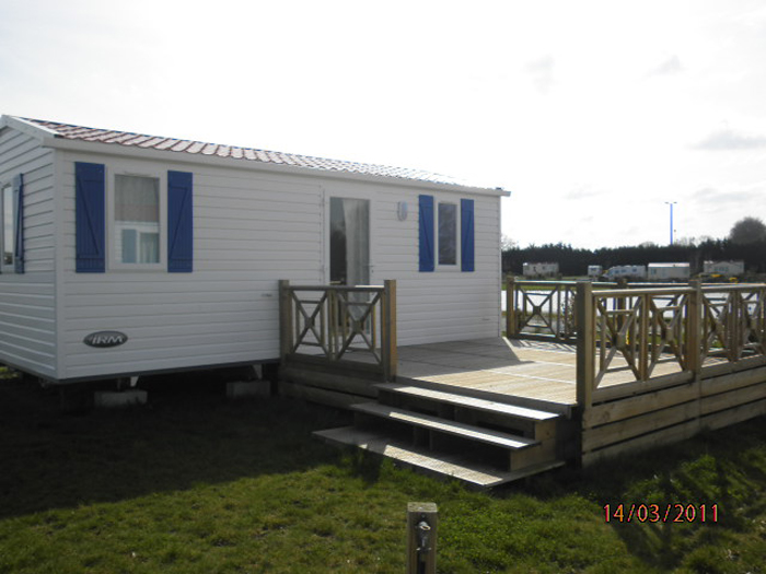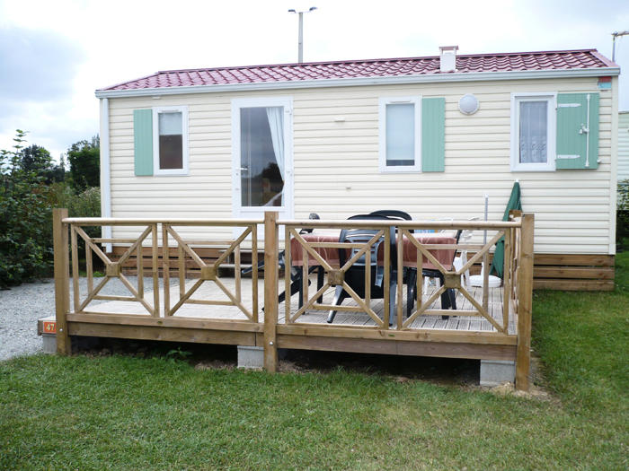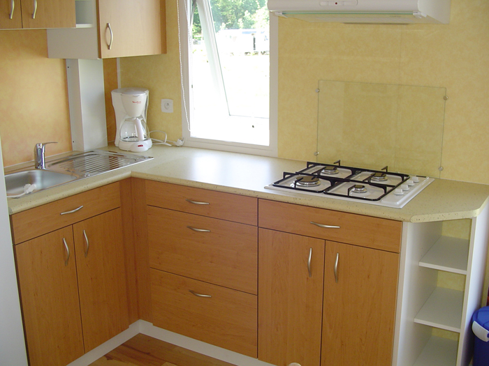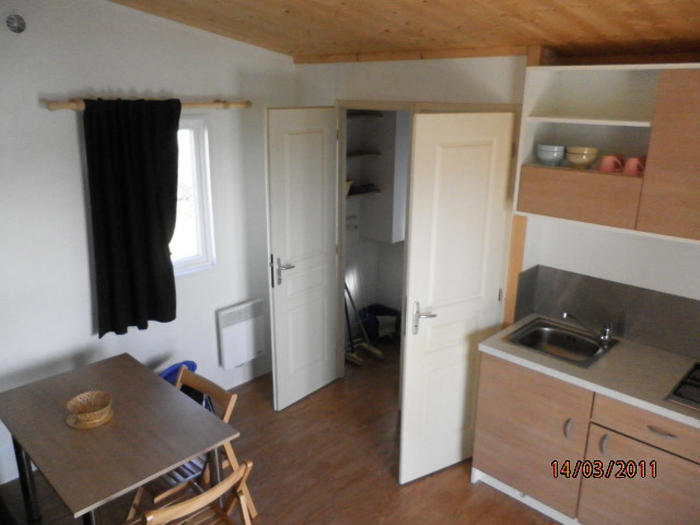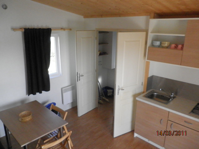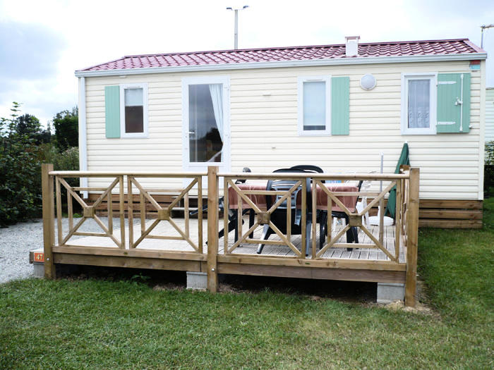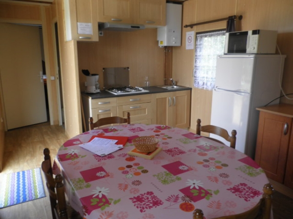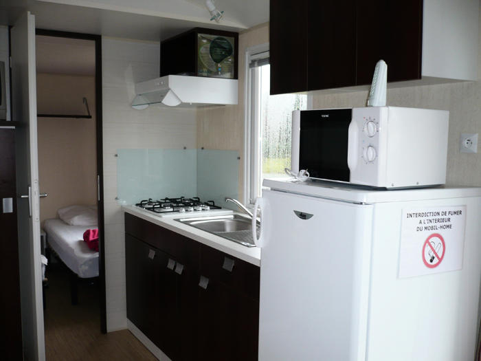 Le Mobil home comprend une cuisine équipée avec réfrigérateur, cafetière et micro-ondes. Il dispose également d'une terrasse non couverte de plain-pied de 30m².