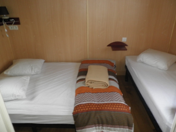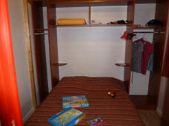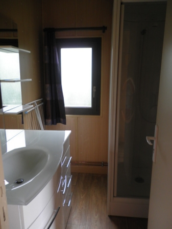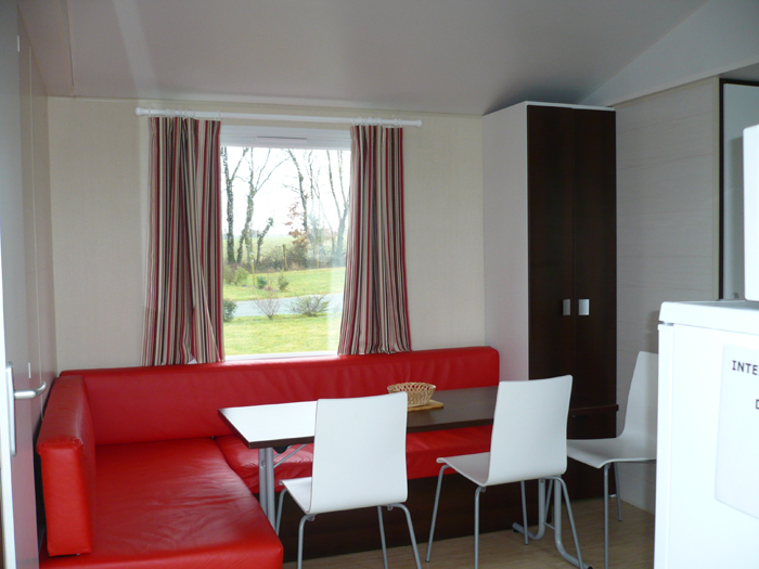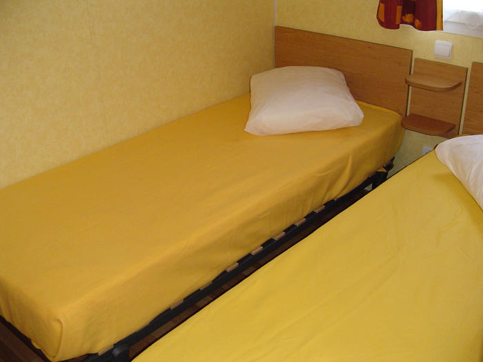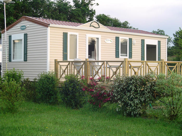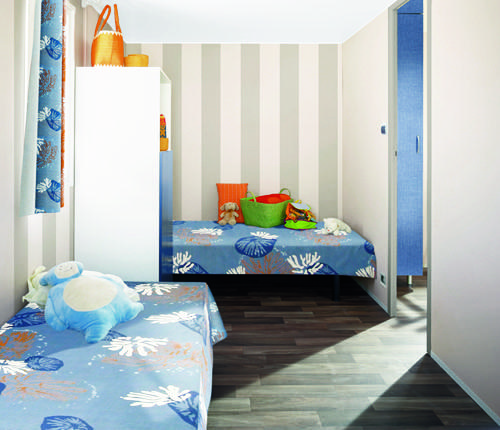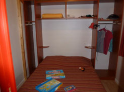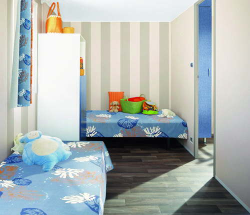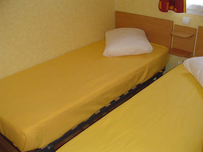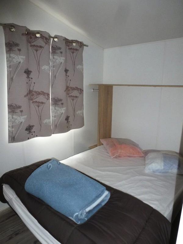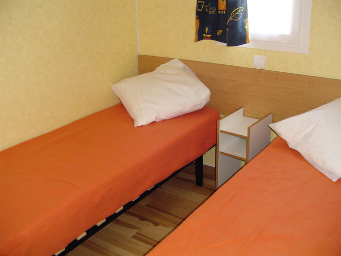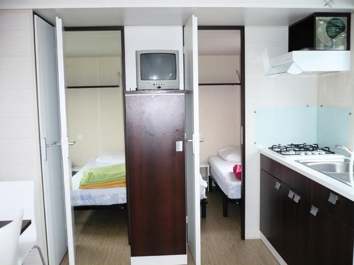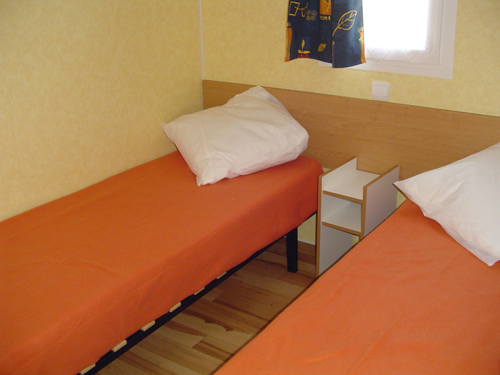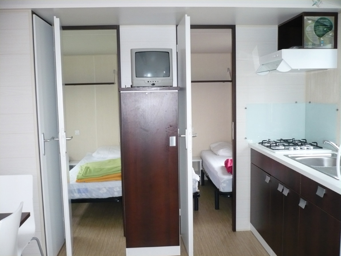 Mobil Home 4/5 personnes de 25m², composé d'une chambre avec un lit double, d'une 2nd chambre avec 2 lits simples, dans cette chambre un emplacement est réservé pour un lit bébé ou un lit d'appoint, d'un séjour, d'une cuisine, d'une salle de bain avec toilettes et d'une terrasse non couverte.