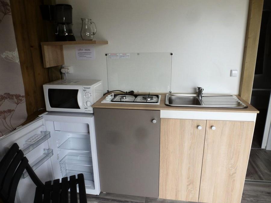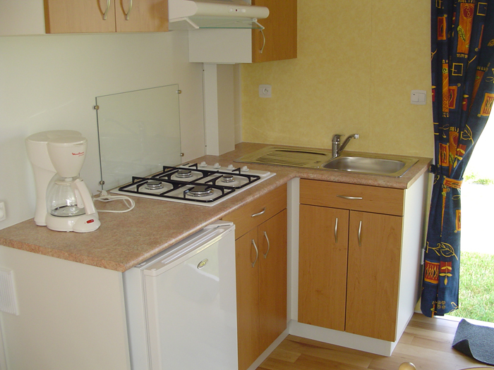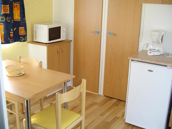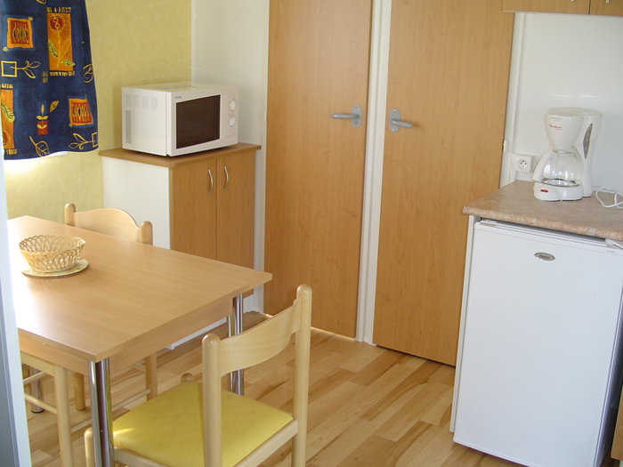 Le Mobil Home comprend une cuisine avec réfrigérateur, d'un micro-ondes, d'une cafetière électrique. L'équipement comprend également une terrasse non couverte composée d'un salon de jardin et d'un parasol (sur demande).