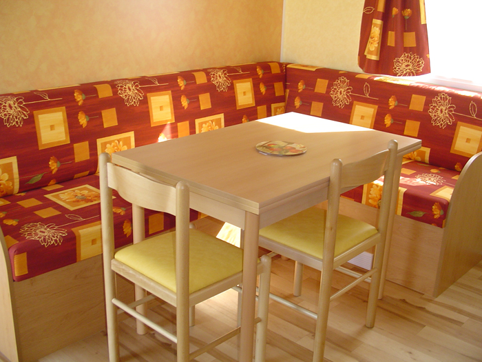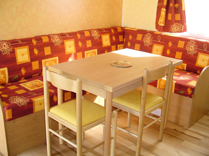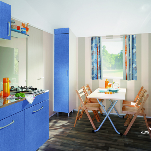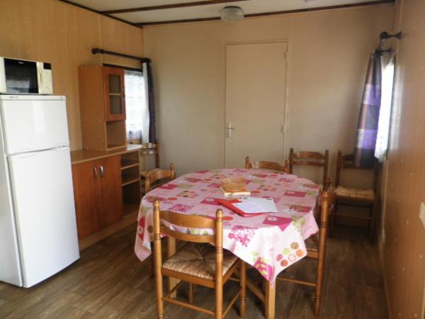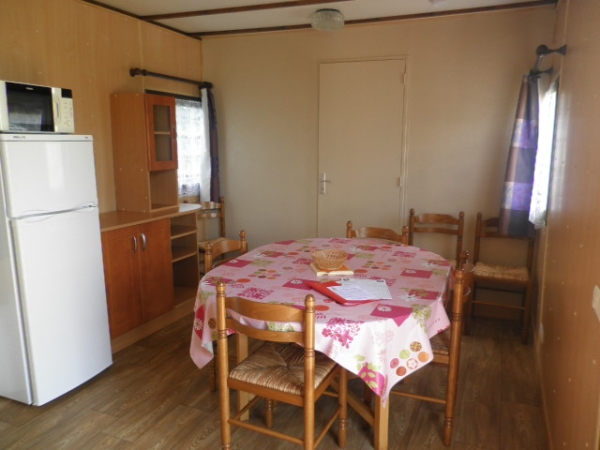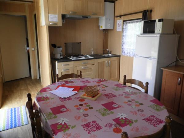 Le Mobil Home comprend une cuisine équipée avec réfrigérateur, d'un micro-ondes, d'une cafetière électrique ainsi que tous les ustensiles de cuisine nécessaires et la vaisselle. L'équipement dispose également d'une télévision et d'une terrasse couverte composée d'un salon de jardin et d'un parasol (sur demande).
