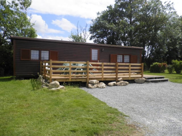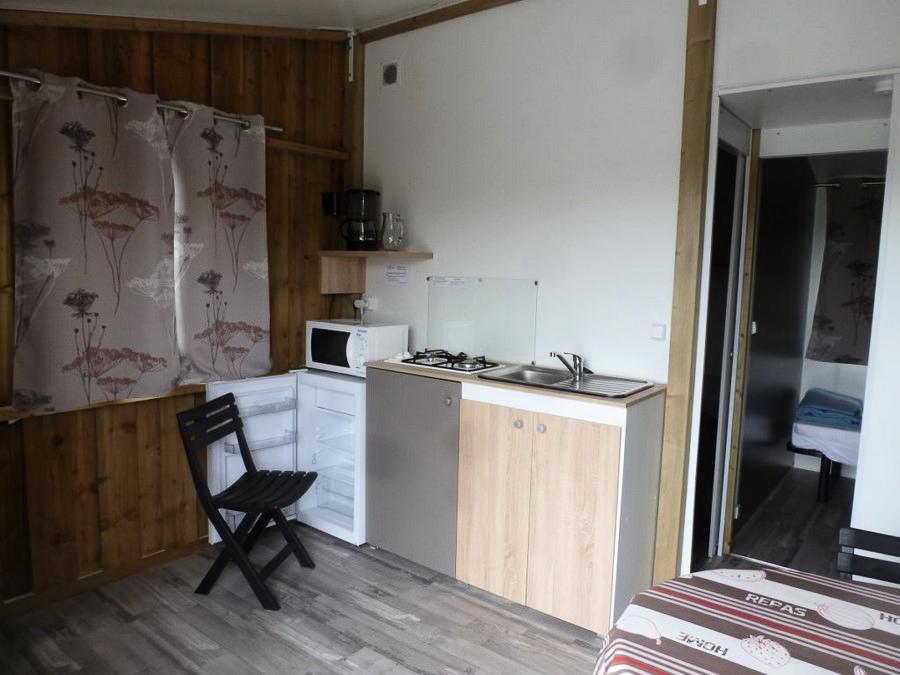 Le chalet comprend une cuisine avec réfrigérateur, micro-ondes et cafetière électrique. L'équipement comprend également une terrasse couverte composée d'un salon de jardin et d'un parasol (sur demande).