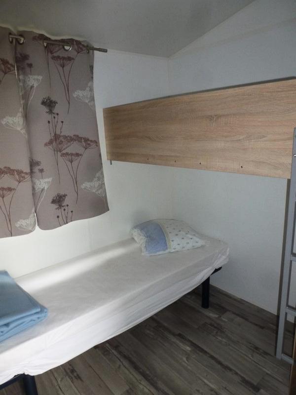 Mobil Home 3 Pièces 6/7 Personnes de 38m², composé d'une cuisine aménagée avec un coin repas, d'une chambre avec un lit double et 2 lits superposés, d'une chambre avec un lit double et un lit simple, d'une salle de bains avec WC.
