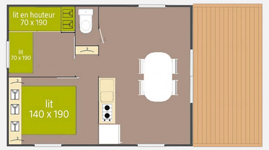 Chalet 3 pièces pour 4 personnes de 20m², composé d'une chambre avec un lit double, d'une chambre avec un lit simple et lits superposés, d'un coin repas, d'une cuisine équipée, de WC et d'une terrasse non couverte.