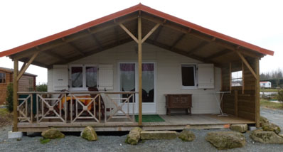 Chalet 2/4 personnes de 18m², composé d'une chambre avec 2 lits simples, d'un séjour avec un lit de 2 personnes, d'une cuisine, d'une salle de bains, de toilettes et d'une terrasse couverte.
