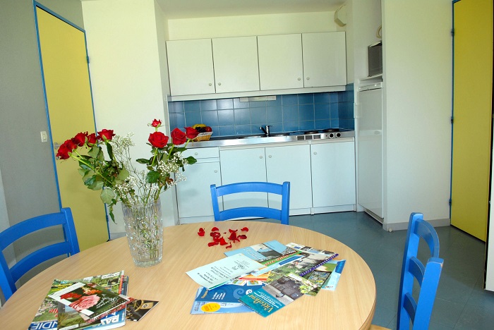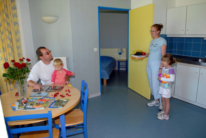Appartement de 3 pièces de 5 personnes de 40 à 43m², composé d'un séjour, d'une chambre avec un grand lit ou deux lits simples, d'une chambre avec deux lits une personne plus un lit tiroir, d'une kitchenette équipée, d'une salle d'eau (douche, lavabo, WC) par chambre. Terrasse.A noter : Certains appartements sont adaptés pour les personnes à mobilité réduite. Contacter le service information et réservation pour plus de renseignements.