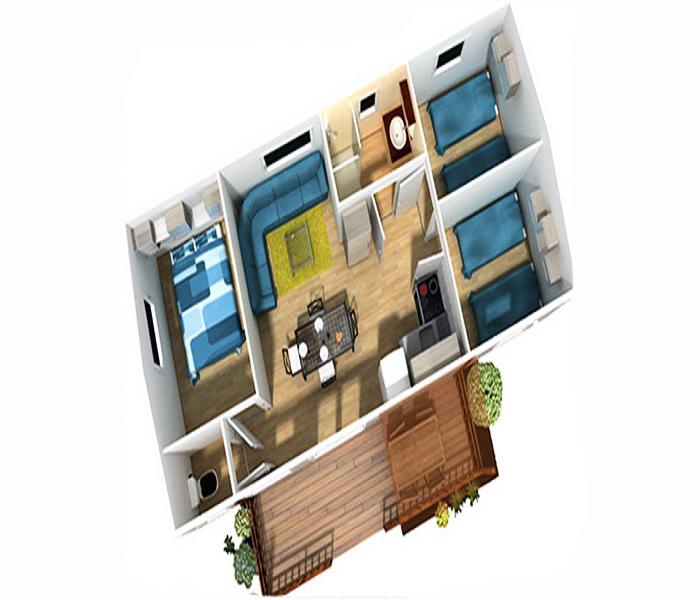 Mobil Home 4 Pièces 6 Personnes de 29 à 31m², composé d'un séjour avec coin cuisine, d'une chambre avec un lit double, de 2 chambres avec chacune 2 lits simples, d'une salle de douche, de WC séparés, d'une terrasse semi-couverte.