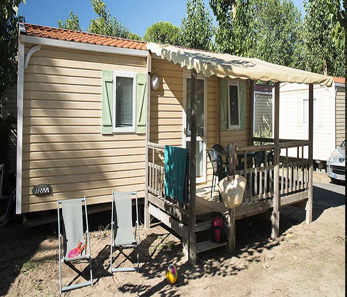 Mobil home de 28m² de 3 pièces pouvant accueillir 6 personnes.Il est composé d'un séjour transformable en couchage pour deux personnes, d'un coin cuisine, d'une chambre avec 1 lit double (140cm), d'une chambre avec 2 lits simples (80cm) jointifs et d'une salle de bain avec douche et toilettes séparés.