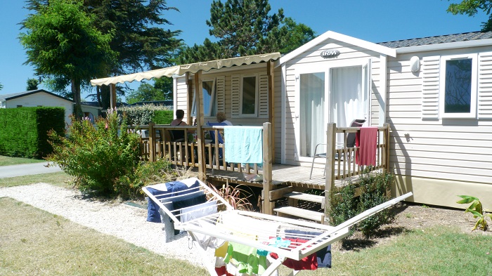 Mobil Home 4 pièces pour 6 personnes de 31 m² environ composé d'un coin cuisine équipé, d'un coin salon, d'une chambre avec un lit double (140cm), d'une seconde chambre avec 2 lits simples, d'une salle de douche, de WC séparés et d'une terrasse en bois couverte avec salon de jardin.