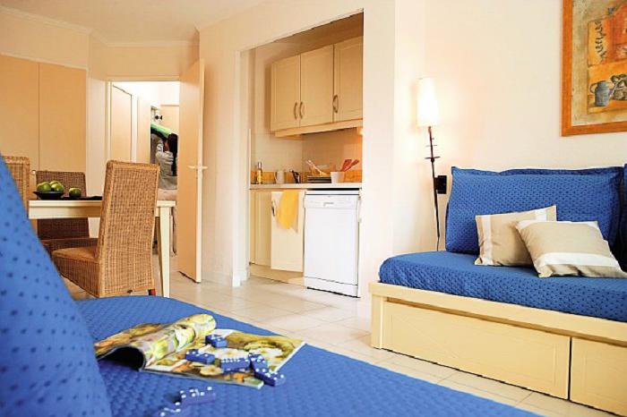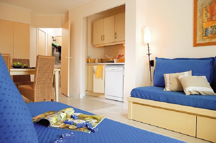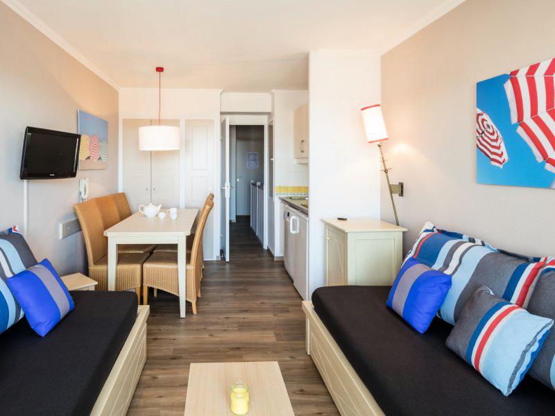 Appartement de deux pièces pour quatre ou cinq personnes d'environ 26m² comprenant un séjour avec deux banquettes lits simples dont une avec un lit gigogne, une chambre avec un lit double, une kitchenette, une salle de bains et des toilettes.