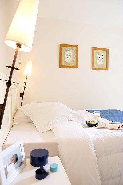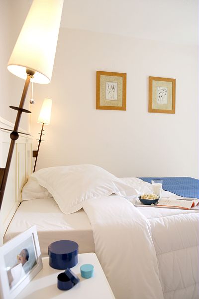 Appartement de deux pièces pour quatre ou cinq personnes d'environ 26m² comprenant un séjour avec deux banquettes lits simples dont une avec un lit gigogne, une chambre avec un lit double, une salle de bains et des toilettes.