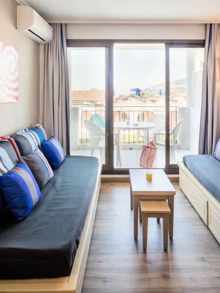 Studio pour quatre ou cinq personnes d'environ 22m² comprenant un séjour avec deux banquettes lits simples dont une avec un lit gigogne, une cabine avec deux lits superposés, une salle de bains et des toilettes.