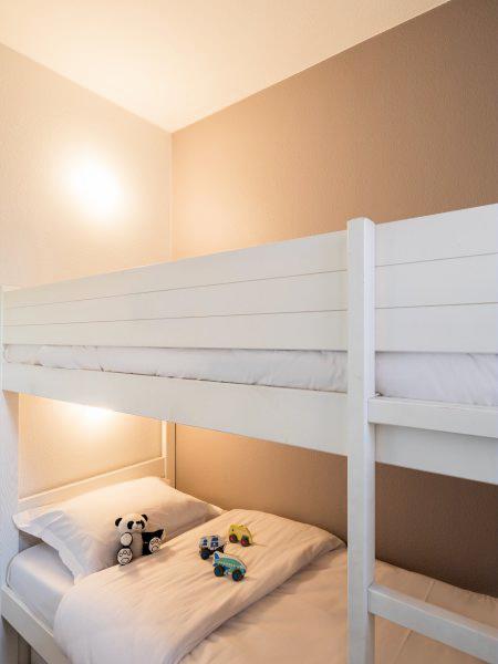 Appartement de deux pièces pour six ou sept personnes d'environ 32m² comprenant un séjour avec deux banquettes lits simples dont une avec un lit-gigogne, une chambre avec un lit double, une cabine avec deux lits superposés, une kitchenette équipée, une salle de bains et des toilettes.