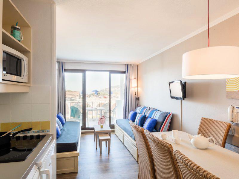 Studio pour quatre ou cinq personnes d'environ 22m² comprenant un séjour avec deux banquettes lits simples dont une avec un lit gigogne, une cabine avec deux lits superposés, un coin cuisine, une salle de bains et des toilettes.
