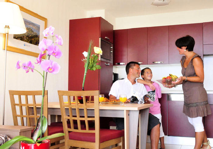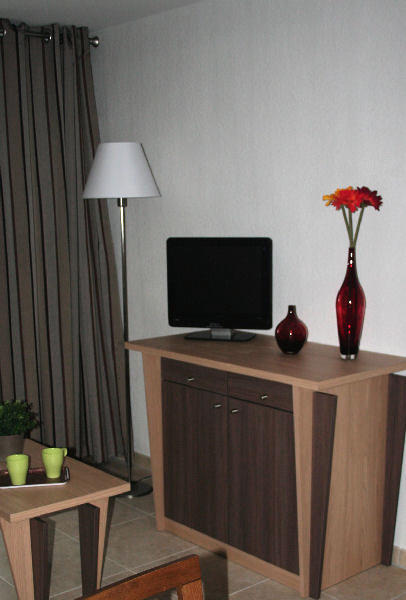Kitchenette parfaitement équipée : lave-vaisselle, four micro-ondes grill, plaques vitrocéramiques (2 feux pour les 2 pièces, 4 pour les 3 pièces), hotte aspirante, grille-pain, cafetière électrique, réfrigérateur (avec partie congélateur pour les 3 pièces). Salle de bains avec radiateur sèche-serviettes, WC séparés.Tous les appartements disposent soit d’un rez-de-jardin soit d’une terrasse équipée d’un salon de jardin. 2 pièces 4/5 personnes, 35 m² environ avec une terrasse ou un jardinet de 7 à 12 m² : séjour avec 1 canapé-lit convertible 2 couchages et 1 chauffeuse (véritable lit d’appoint 1 personne), 1 chambre avec 1 lit double en 140 cm.
